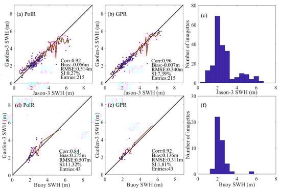 Plots of Gaofen-3 SWH retrievals from the final PolR and GPR models versus SWH measurements from Jason-3 altimeter and NDBC buoys. (a) Estimates via PolR versus Jason-3 SWH. (b) Estimates via GPR versus Jason-3 SWH. (c) Histogram of Jason-3 SWH. (d) Estimates via PolR versus buoy SWH. (e) Estimates via GPR versus buoy SWH. (f) Histogram of buoy SWH. Red lines join the mean values of SAR estimates in each 0.1 m bin of the measured SWH.