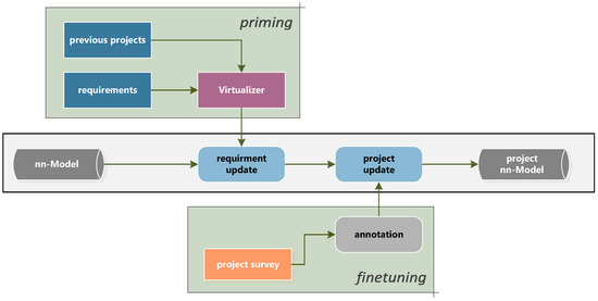 Overview of priming methodology. In case of a new survey, the Virtualizer will convert the CAD models into synthetic point clouds based on the new project requirements. These point clouds are used to update and preconfigure the nn-Model, reducing the data and training requirements on the second survey-driven updating step. The result is a project-specific neural network.