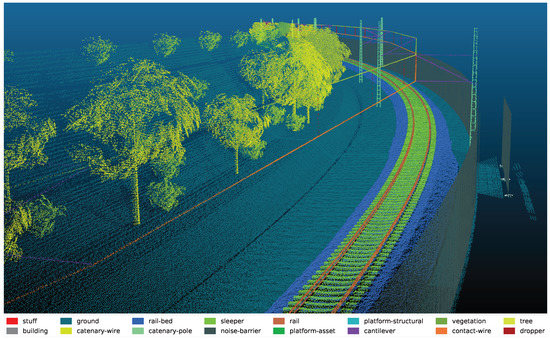 The primary sensor types when recording railway infrastructure are LiDAR and/or cameras. While the latter can provide highly detailed information about the objects themselves, the 3D geometry is missing or needs to be time-consumingly reconstructed. These image-based reconstructions display poor geometric accuracy [5]. Due to this limitation, image-based approaches have been exclusively used for maintenance or inventory assessment. Some maintenance examples can be found in [6,7,8]. In contrast, LiDAR-based systems can provide the high geometric accuracy needed for remodelling. This geometry can be used as a 3D skeleton to attach further semantics.