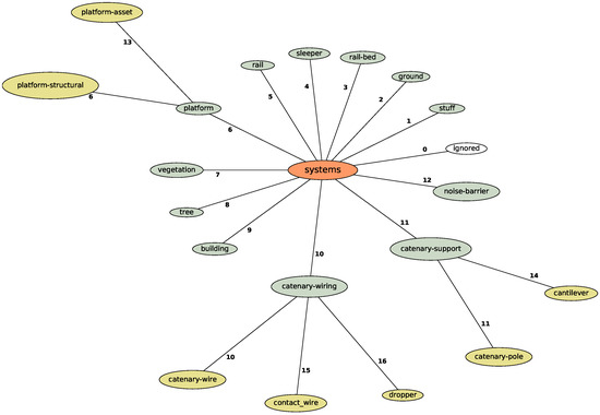 The four additional categories introduced in the 16-system hierarchy mostly refine the catenary. This breaks the catenary–wiring down into catenary–wire, contact–wire and dropper and catenary–support into catenary–pole and cantileve. Additionally, in the 16-systems variant the system platform is separated into platform–structural objects such as stairs, cornerstones or a deck and platform–assets such as speakers, seats and rubbish bins. We reused the unchanged class numbering to make the data as comparable as possible.
