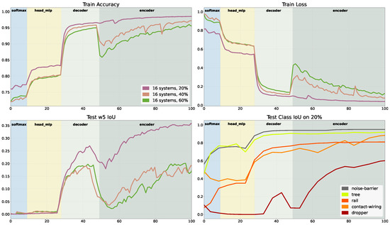 While the mean intersection over union () is still provided, it is not recommended to use as a benchmark for these recognition problems. This is due to the fact that the classes are very unbalanced, with a railbed having approximately 40% of the points and wires or catenary masts <1%. From an engineering perspective, these components might be even more critical than the railbed. When possible, the and the () are used in this paper.