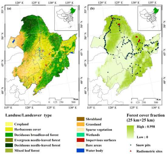 Northeast China (38°72′–53°55′ N, 115°09′–135°52′ E) is located in the mid-latitude of the northern hemisphere, covering a total area of approximately 1.2 million km2 and with an elevation range of 0–2667 m. The climate of Northeast China is controlled by the high latitude East Asian monsoon, which includes warm temperate and cold temperate zones latitudinally, as well as semi-arid, semi-humid and humid zones from west to east. The geographical location and climatic conditions of this region creates a relatively complex surface cover system. According to the GLC_FCS30-2015 global land-cover products [28] (free access at https://doi.org/10.5281/zenodo.3986872, accessed on 8 July 2020), Northeast China is dominated by forests, croplands and grasslands, as shown in Figure 1a, accounting for about 40.4%, 36.9% and 13.1% of the total area, respectively. Forest cover is widely distributed in the mountainous areas, including the Greater Khingan Mountains, Lesser Khingan Mountains and Changbai Mountains areas [29]. The forest cover fraction data within each passive microwave satellite pixel (25 km × 25 km) are calculated (Figure 1b). The areas of deciduous broad-leaved forests and deciduous coniferous forests of forestry land in Northeast China are superior, which are 73.1% and 22.4% of the total, respectively. In addition, Northeast China is one of the three primary snow-covered regions (Xinjiang, Northeast China and the Qinghai-Tibet plateau) in China [30,31]. In winter, snowfall is frequent and evenly distributed, and snow cover lasts from November until April. The maximum snow depth (MSD) in Northeast China forest area generally shows a spatial distribution characteristic, gradually deepening from southwest to northeast, with variations ranging from 5–9 cm incrementally to 21–32 cm [32]. Rich snow resources and forest diversity make Northeast China an ideal region for forest snow research.