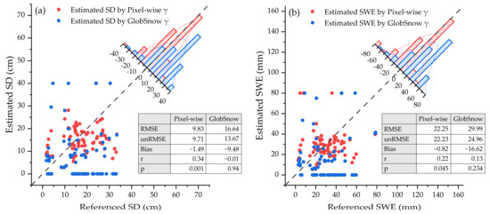 The SD and SWE results obtained by inversion with the Pixel-wise algorithm and GlobSnow algorithm, respectively, are shown in Figure 3, and the evaluation metrics are also superimposed in Figure 3.