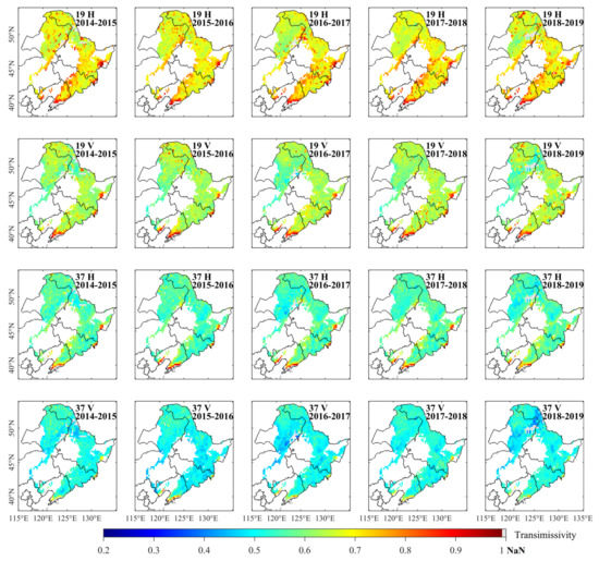 Developing transmissivity models at large regional scales is relatively difficult, especially for model validation, which requires more data support and careful experimental design. However, from the inversion results of snow parameters, the algorithms and products of the pixel-level transmissivity models developed in this research are still expected to further expand the spatial and temporal applications, and more detailed model refinement is needed in the future. This paper provides a product of dual-frequency and dual-polarized forest transmissivity datasets for five consecutive winters, of which the application area extends beyond Northeast China. It is expected to be used for global historical snow data reproduction and climate change analysis.