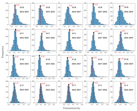 Estimation results of annual transmissivity under horizontal and vertical polarization at 19 GHz and 37 GHz.