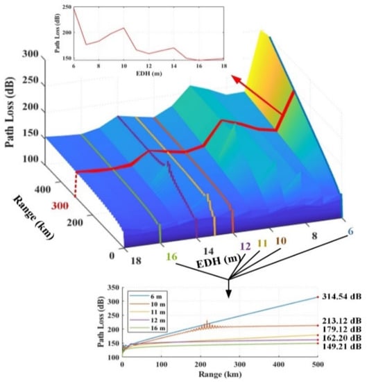 In Figure 1, the path loss curves varied considerably with different EDH. Path losses increase with the EDH fixed at 6 m and lower than the antenna height, resulting in a poor communication effect. Significant improvement of channel conditions arises when the EDH is between 16 m and 18 m and the path loss fluctuates around 150 dB. Overall, the transmission loss fluctuates with the increase of the EDH. Especially in the range of 10–12 m, a 1 m variation in the height may lead to an increase in the path loss at 500 km of 16.92 dB to 34.00 dB, which brings much uncertainty to the operation of the communication system. This is roughly the same as the results of [,].