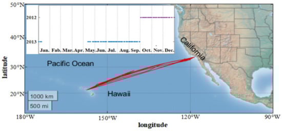 To verify the prediction accuracy of existing models and to explore a better method, we use measured meteorological data from the ship-based marine ARM GCSS Pacific cross-section intercomparison (GPCI) investigation of clouds (MAGIC) field campaign. The ship-based MAGIC field campaign, with the marine-capable second ARM mobile facility (AMF2) deployed, lasted for nearly 200 days between Los Angeles, California and Honolulu, Hawaii, which provided high-resolution measured datasets of clouds, precipitation, and marine boundary layer (MBL) [,]. The ship completed 20 round trips from October 2012 to September 2013. Lots of instruments were deployed to measure meteorological parameters aboard the ship throughout the campaign: a Vaisala weather station, an inertial navigational location and attitude system, an infrared SST autonomous radiometer (ISAR), radiosondes, etc. [].
