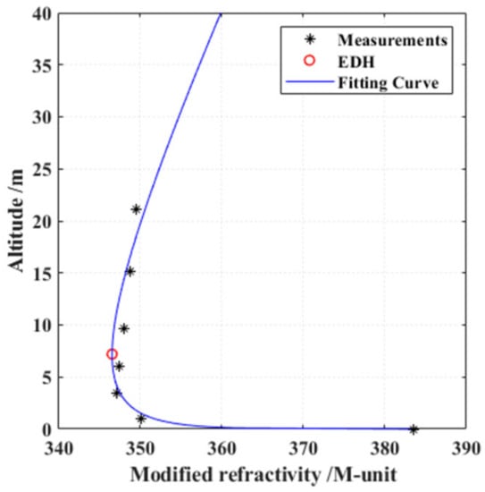 where M is the modified refractivity (M-units) and h is the altitude (m). f0, f1, and f2 are coefficients that can be calculated for a least-squares best fit. The constant 0.001 was used to prevent the curve from blowing up at zero altitudes [,].