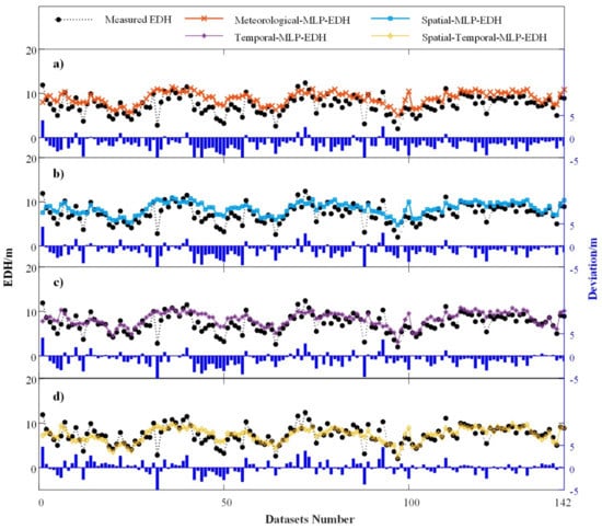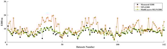 The RMSE of the spatial–temporal-MLP-EDH model has improved to 1.54 m and the parameters as a coefficient of determination and variance of prediction error still have room for improvement. Adding the temperature, RH, and wind speed at an additional height, new datasets with the original parameters may improve prediction accuracy. The comparison results with measured data, EDH predicted by the NPS model, and the multilayer-MLP-EDH model are shown in Figure 8.