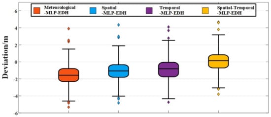 - The statistical results in Figure 7 show the deviation variation of the abovementioned models. The box of each frequency represents the upper and the lower quartiles of the deviations and the horizontal line in the middle of the box is the median of deviations. The black line connected with the colored box shows the confidence interval of the deviations. Diamond symbols of corresponding colors represent outliers that deviate from the confidence range. The variation range of each model changes on a small scale, but the median value of deviation changes from -1.57 m of the meteorological-MLP-EDH model to 0.13 m of the spatial–temporal-MLP-EDH model, which is essentially in agreement with the measurements on a large scale.