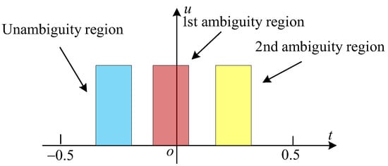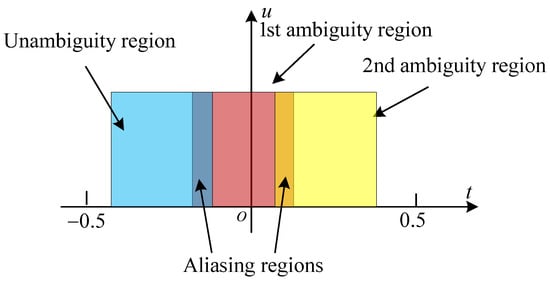 Subsequently, the data in Figure 4 can easily mitigate range ambiguities by time domain filters. Significantly, the essence of the proposed method is that the coupling term of the range and the Doppler frequency produces a shifting time in the slow-time domain. Therefore, if the illumination time is longer than the shifting time of the different ambiguous regions caused by the proposed method, the aliasing is brought among different ambiguous regions in Figure 5. So, the applicable conditions of the proposed method are explored further in this paper.