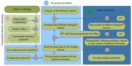 where denotes the azimuth resolution. Therefore, these restrictions are not satisfactory. Fortunately, from (15), it can be seen that there is the ambiguous range in the function phase, namely . Meanwhile, the causes of the overlap in the two-dimensional time domain are that the echoes of ambiguous regions are shifted into the unambiguous region on the echo of other slow time. Therefore, to eliminate the limitation in azimuth, we divide the Doppler domain into multiple sub-bands in a synthetic aperture time (the number of sub-bands is ). Then, the data of different ambiguous regions are distinguished by the proposed method in the slow-time domain for the signals of different sub-bands. Thereafter, all sub-band data of every ambiguous region are spliced in the Doppler domain. Finally, focused images in different ambiguous regions are acquired in the slow-time domain. Thus, as these processes have one more FT and IFT operations than the direct solution, the computational complexity increases by approximately ( is the number of slow time sampling points). In this way, the advantage of this process is that, although the computational complexity is increased, the constraint is relaxed. Namely, the proposed method makes a tradeoff between the computational burden and the azimuth resolution, and a block diagram of the proposed method is illustrated in Figure 6.