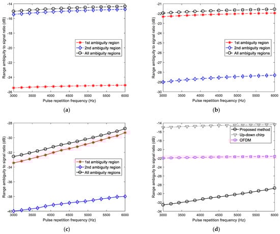 Range-ambiguity-to-signal ratio versus PRF: (a) the up-down chirp method; (b) the OFDM method; (c) the proposed method; (d) different methods for all ambiguous regions.