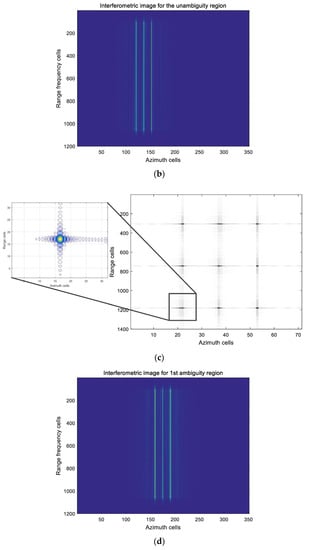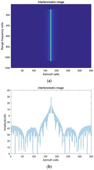 Assume that there is only one center point in each region, these center points have the same azimuth position in their respective regions, and the range between two continuous regions is the maximum unambiguous distance. Therefore, the measured echo delays of these center points are the same, such that the echo data of the points overlap in the range-time domain. Figure 8a depicts the interferometric image after range pulse compression by using traditional MISO-SAR (without using DDMA waveforms). Figure 8b is the elevation slice diagram of Figure 8a. As observed, the echo data of all points overlap in the same place. Thus, the different ambiguous regions are indistinguishable. For DDMA-SAR, there is a coupling term between the Doppler frequency and the range in the two-dimensional frequency domain. Hence, after transforming the interferometric image between the two channels into the azimuth-time domain, the points in different ambiguous regions can be distinguished. Moreover, the interferometric image between the two channels is described in Figure 8c. It can be seen that not only the center points in different ambiguous regions are separated in the azimuth-time domain, but also the offset of azimuth time increases with the increase in range. This property can help us to design a passband time filter to extract data from different regions.