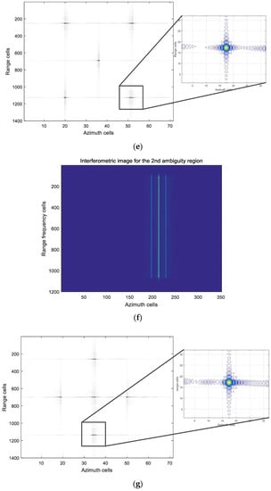 In DDMA-SAR, the interferometric image processed by the proposed method is shown in Figure 12a. Afterwards, we can process the interferometric data to separate it into the data of different regions by using the above designed passband time filters. Figure 12b,d,f are the separated interferometric images for the unambiguous region, the ambiguous region, and the ambiguous region, respectively. As the two-order range frequency term has been removed, the points in the unambiguous region are focused by IFT for the range dimension in Figure 12c. Compared with Figure 11b and Figure 12c, the energy from other ambiguous regions has been suppressed, such that the focused points in Figure 12c are clearer than those in Figure 11b. Similarly, the images in Figure 12d,f are processed as Figure 12e,g. Then, the image results of the full swath are obtained. It indicates that the jamming signal is suppressed except for the signal of the desired range region, and the points in the desired range region can be focused. As a result, the range ambiguous echoes can be separated effectively into signals of three regions by the proposed mitigating range ambiguity method based on DDMA waveforms, and the full imaging results can be obtained.
