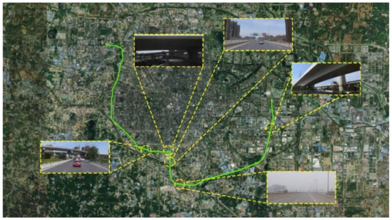To evaluate the positioning performance of PPP-RTK/INS tight integration, we performed three sets of vehicle experiments in the urban environments of Zhengzhou and Wuhan, China, respectively. Experiment A was conducted in Wuhan from GPS time (GPST) 7:00:00 to 8:04:00 on 13 October 2021, and the trajectory of the vehicle is shown in Figure 2, wherein the green line represents the complex urban environment with seriously blocked GNSS signals, which we name period 1 (0–500 s); the red line represents an improved GNSS observation condition, which we name period 2 (500–3600 s). Experiment B was conducted in the overpasses of Zhengzhou from GPST 5:44:00 to 6:40:00 on 8 July 2022, and its trajectory is shown in Figure 3. During experiment B, GNSS was temporarily interrupted due to passing through several overpasses. Experiment C was also executed in Wuhan from GPST 8:22:30 to 9:00:00 on 13 October 2021, and its trajectory is shown in Figure 4. In the third experiment, the GNSS signal was blocked by residential buildings, overpasses, short tunnels, etc., resulting in several observation interruptions. It should be noted that the static period of three experiments was used for the initial alignment.