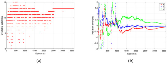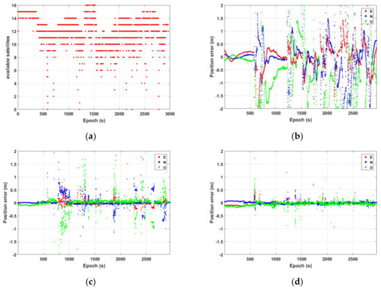 (a) The number of available satellites in experiment B. (b) Position error sequence of float PPP. (c) Position error sequence of PPP−RTK. (d) Position error sequence of TC PPP−RTK/INS.