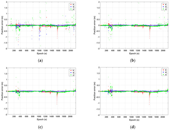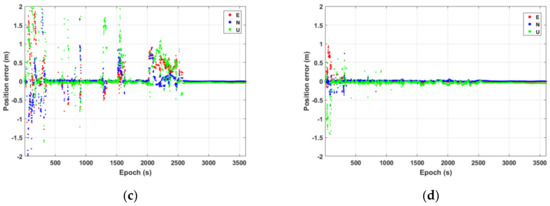 Figure 12 shows the number of available satellites and the position accuracy of TC PPP-RTK/INS under different schemes. The red and blue lines represent the number of available satellites of Septentrio PolaRx5 and ublox F9P receivers, respectively. The position errors of F9P-ADIS, F9P-XW, SEPT-ADIS, and SEPT-XW are shown in Figure 13a–d, respectively. As shown in Figure 12, the number of available satellites of the ublox F9P receiver was less than that of the Septentrio receiver most of the time, and the statistical results show that the average number of available satellites of the Septentrio PolaRx5 receiver was 10.77, or 9.95 using ublox F9P receiver. Compared with the SEPT-XW scheme, F9P-ADIS had more gross errors, but there was no significant difference between them in most epochs. Compared with F9P-ADIS, F9P-XW eliminated some gross errors using the tactical IMU. When it was close to 1600 s, the E component of the three schemes all showed a large deviation, which may be caused by the undetected gross errors of GNSS observations.