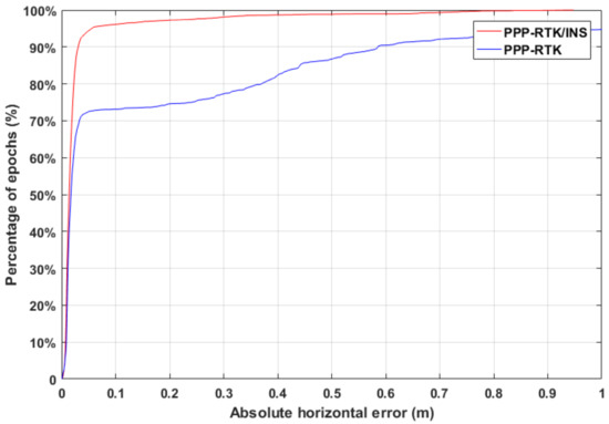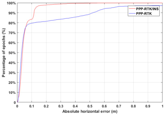 Horizontal positioning accuracy is considered more important for vehicle navigation in the urban environment. Figure 7 shows the positioning availability of PPP-RTK and TC PPP-RTK/INS in experiment A. The blue line and red line represent the percentage of horizontal error that does not exceed the specified threshold for PPP-RTK and TC PPP-RTK/INS, respectively. It can be seen that the initial rise of the curve is rapid, especially within 0.1 m, indicating that, most of the time, the horizontal accuracy can reach the decimeter level. Besides, the initial coincidence of the two curves also indicates that the high-accuracy positioning of the vehicle mainly depends on the conditions of GNSS observation. Under the open observation environment, no significant difference in the positioning accuracy between PPP-RTK and TC PPP-RTK/INS existed, and both of them were able to reach an accuracy of several centimeters. However, when GNSS signals were interrupted intermittently and the number of available satellites varied drastically, the positioning accuracy could be maintained with the augmentation of INS, and hence, the positioning availability of TC PPP-RTK/INS is better than that of PPP-RTK.