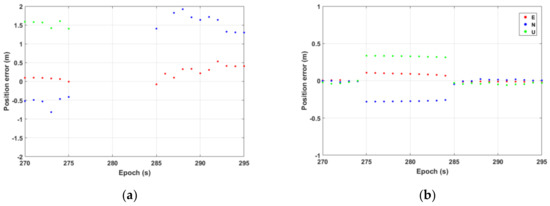 Position errors in the E, N, and U components from 270 s to 295 s in experiment A. (a) PPP−RTK. (b) TC PPP−RTK/INS.