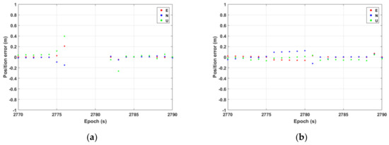 Position errors in the E, N, and U components from 2770 s to 2790 s in experiment B. (a) PPP−RTK. (b) TC PPP−RTK/INS.