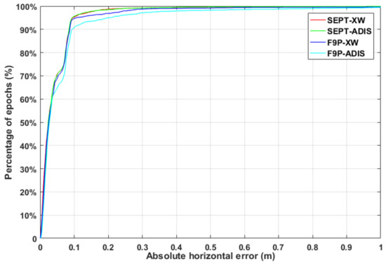 Figure 14 shows the positioning availability under different schemes, in which the red, green, blue, and cyan lines represent SEPT-XW, SEPT-ADIS, F9P-XW, and F9P-ADIS, respectively. It can be seen that there was no significant difference between SEPT-XW and SEPT-ADIS schemes, but there was a significant difference between the scheme using the geodetic receiver and low-cost receiver, indicating that the observation quality of GNSS data had a significant influence on the TC PPP-RTK/INS. At the same time, obvious differences can also be seen between the two schemes of F9P-ADIS and F9P-XW using the low-cost receiver, indicating that the GNSS data observation quality received by the low-cost receiver was poor, and by combining with tactical IMU, the positioning accuracy can be improved, and some gross errors can be removed.