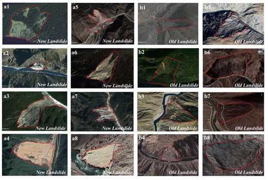 Figure 3. The landslide instances in the LRSTTC dataset. (a1–a8) are new landslides that just occurred recently; (b1–b8) are old landslides that occurred for a long time. - (2)