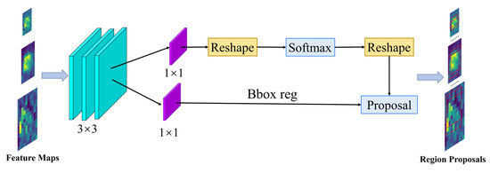 The RPN network is divided into two lines (Figure 7), where regional proposals are generated. The anchors are classified into positive and negative by softmax in the top branch of Figure 7, and the bounding box regression offset for the anchors is calculated to obtain the exact proposals in the bottom branch. In the proposal layer, the positive anchors and the corresponding border offsets are synthesized, and proposals that are too small or out of bounds are eliminated.