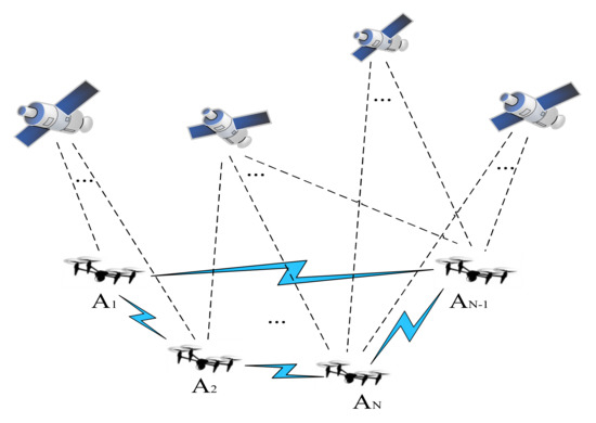 In Figure 1, A1, A2, AN-1, and AN all represent UAVs, while AN represents the n-th UAV. UAV positioning can be realized by a base station or cluster UAV. In the figure, the blue link represents the ranging communication link between UAVs. Meanwhile, the UAV is equipped with a satellite receiver and inertial measurement unit (IMU), which can receive satellite navigation signals and information such as speed and acceleration.