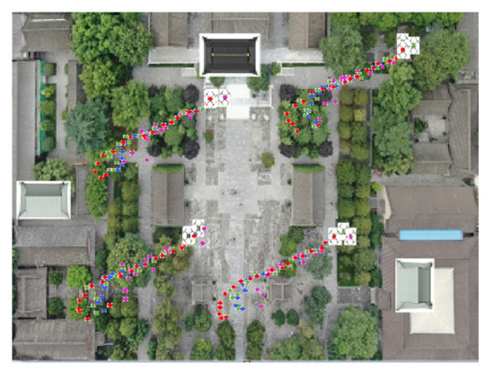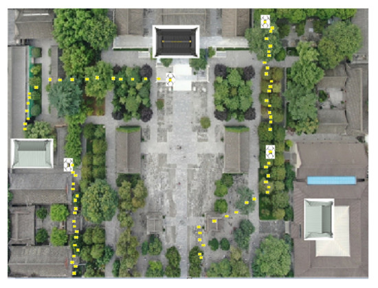The experimental site selects some buildings of Xi’an’s classic landmarks, the Big Wild Goose Pagoda and the Da Ci’en Temple, and builds them under the guidance of actual aerial photos, as shown in Figure 4a. In this paper, the aerial photos of the scenic spot are scaled down and painted, and the painting specifications are long and wide. The landmark buildings in the figure are simulated by using cardboard boxes and placed in corresponding positions, respectively. The established test positioning site is shown in Figure 4b.