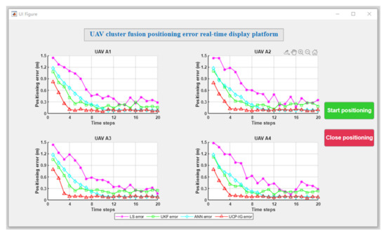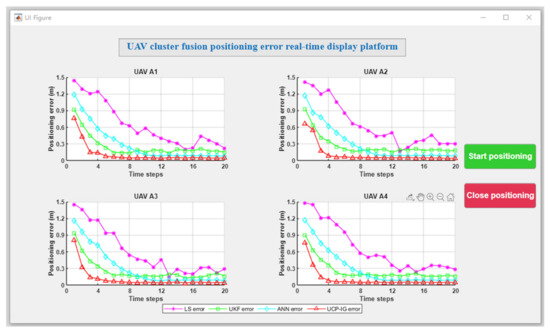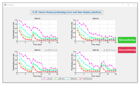 In the process of UAV movement, satellite navigation sources may lose signal or offset error due to the occlusion of buildings and environmental interference. In this section, the initial positions of the UAVs were set as follows: UAV A1 (1.17 m, 0.98 m, 0.22 m), UAV A2 (4.29 m, 4.75 m, 0.26 m), UAV A3 (0.42 m, 6.56 m, 0.27 m), and UAV A4 (2.24 m, 0.50 m, 0.30 m). The movement trajectory of the four UAVs is shown in Figure 11. In this occlusion scenario, satellite signal loss or navigation signal deviation occurs due to occlusion. Among them, UAV A1 and UAV A3 lost satellite signal in unit time 6–10, and UAV A4 had navigation signal deviation in unit time 11–16. The motion positioning results of the UAVs with four algorithms are shown in Figure 12, in which the purple trajectory represents the positioning results of the LS method, the green trajectory represents the positioning results of the UKF method, the blue trajectory represents the positioning results of the ANN method, and the red trajectory represents the positioning results of the UCP-IG method. The corresponding positioning error fluctuation of the four algorithms is shown in Figure 13 on the GUI error display platform.