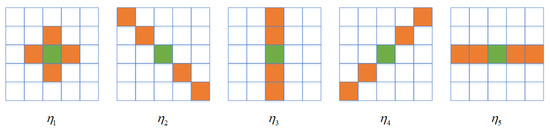 The AN system has five types of neighborhoods, i.e., , as shown in Figure 1. Each type in the AN system has a different shape. The most suitable neighborhood of the center pixel is selected from the five candidates. In [25], the most suitable one is selected by the following criterion: