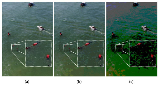 These experiments are based on multispectral data of the SeaDronesSee data set. The usefulness of the additional channels depends strongly on the application. For the maritime environment, additional information is beneficial, especially in the near-infrared channel. This wavelength range is absorbed by water [45], resulting in a foreground mask (an example is shown in Figure 4).