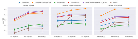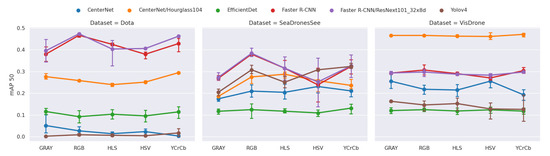 We can conclude two essential outcomes of the experiment for color models. First, we must distinguish between two situations visible in Figure 7. In the first situation, the object detectors cannot take advantage of the color information. Therefore, we assume the color is, in this case, not beneficial. This applies to the VisDrone data set and the Dota data set. Both data sets provide objects and backgrounds with a high color variance. For example, a car in the VisDrone data set can have any color. Thus, the texture and shape are more relevant. That means the object detector can already achieve excellent results with the gray-scale recordings. The color information for the Dota data set could only be utilized by the largest models (Faster R-CNN/ResNext101_32x8d and CenterNet/Hourglass104). The other models couldn’t incorporate color and relied only on texture or shape.
