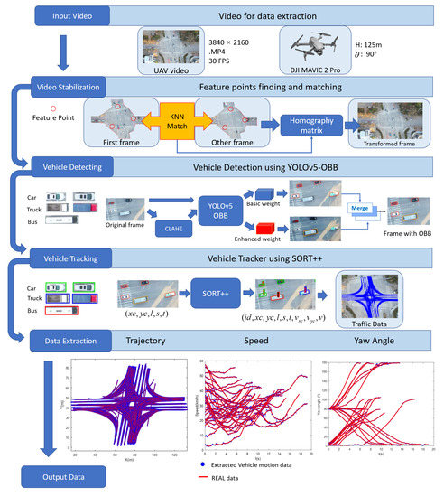 As shown in Figure 1, our framework contains four steps: video stabilization, vehicle detection, vehicle tracking, and data extraction. Firstly, any random disturbance in the UAV videos is eliminated using a homography matrix obtained by a scale-invariant feature transform (SIFT) operator [35] and K-nearest neighbor (KNN) algorithm. Then, a dual-weight vehicle detection algorithm, namely You Only Look Once version 5 Oriented Bounding Box (YOLOv5-OBB) [36], with a contrast-limited adaptive histogram equalization (CLAHE) method is applied for vehicle orientation detection as the foundation for trajectory construction. After that, the SORT++ algorithm is proposed to track vehicles and obtain motion data from the detection results over time. Finally, vehicle trajectory, vehicle speed, and vehicle yaw angle are extracted from the tracking results based on the vehicle steering model. The details of each step are introduced as follows.