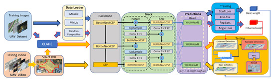 YOLO is the name of a popular object detection algorithm, and the most common version at present is YOLOv5, which obtains high accuracy and is able to detect objects in real time [37]. However, it uses the horizontal bounding boxes (HBB) detector, which is not suitable for vehicle orientation detection in a UAV video. Therefore, we improved the YOLOv5 algorithm by using the OBB detectors, which we called YOLOv5-OBB. Moreover, in order to improve the accuracy of vehicle detection in different environments, we proposed a novel dual-weight method consisting of CLAHE-based image enhancement and the YOLOv5-OBB algorithm. As shown in Figure 2, we first use the original UAV dataset and the UAV dataset enhanced by CLAHE to train the YOLOv5-OBB algorithm and obtain the basic weight and enhanced weight files as the training results, respectively. We then select a region of interest (ROI) in the UAV video. We use the original ROI and the same ROI enhanced by CLAHE as the input data for the YOLOv5-OBB algorithm with basic weight and enhanced weight files. In the end, we perform basic and enhanced vehicle detection. We merge these two types of detections, and we obtain the final vehicle detection results after non-maximum suppression (NMS).