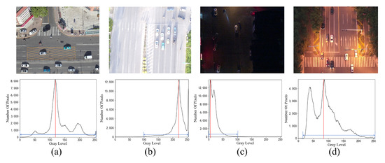 The UAV images captured under different weather conditions have different light intensities. As shown in Figure 3, we can clearly see that the gray level with the peak frequency in the gray-level histogram of the UAV image under sunny conditions is within the range (100, 150), the gray level with the peak frequency in the gray-level histogram of the UAV image under foggy conditions is within the range (150, 255), the gray level with the peak frequency in the gray-level histogram of the UAV image under night conditions with strong light is within the range (50, 100), and the gray level with the peak frequency in the gray-level histogram of the UAV image under weak light conditions at night is within the range (0, 50). Therefore, we can use the gray-level histogram to divide the UAV images into four categories: bright, foggy, weak light at night, and strong light at night.
