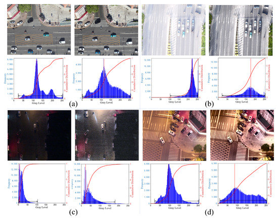 According to the range of gray levels having frequencies greater than 0 in the gray-level histograms of the UAV images, we can see that UAV images in the categories of foggy and weak light at night have poor contrast, and the vehicles in the image are difficult to distinguish from the background. In order to improve detection performance, the contrast in the UAV image should be enhanced by distributing the gray levels over as many ranges as possible to minimize the effects of weather and illumination.
