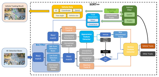 First, the SORT++ algorithm uses the boxes filter (BF) to calculate the rotated intersection over union (RIoU) of oriented detection bounding boxes obtained from the YOLOv5-OBB algorithm. These boxes are divided into high score detection boxes, low score detection boxes, and overlapped detection boxes according to the anchor confidence and RIoU values. Afterward, the second RIoU matching is used to match the high score detection boxes over the current frame with the predicted tracks from the Kalman filter. Subsequently, the unmatched tracks are matched with low score detection boxes by the third RIoU matching, and unmatched detection boxes after the second and third RIoU matching are sent to the appearance feature extractor (AFE) to determine whether they are bounding boxes of vehicles. Then, all the unmatched tracks, matched tracks, and new unconfirmed tracks are classified as vehicle tracks or other tracks by the motion feature extractor (MFE). Finally, the parameters of the vehicle tracks are updated and divided into confirmed vehicle tracks and unconfirmed vehicle tracks by the Kalman filter. We can obtain vehicle data such as ID, image coordinates, speed, vehicle size, and yaw angle from the confirmed vehicle tracks.