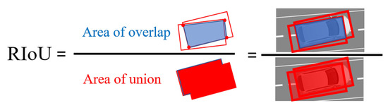 In order to determine whether two detected objects are overlapped and to match the detected objects with tracks, we use RIoU matching [44]. As shown in Figure 6, RIoU is the ratio of the overlap to the union of the two OBBs. RIoU represents the accuracy of the prediction model, and the RIoU value of the same vehicle is approximately 1, which shows the least prediction error. A threshold is set for RIoU matching. If the RIoU values exceed the threshold, the Kalman predicted track and unmatched detections of the current frame have been successfully associated.