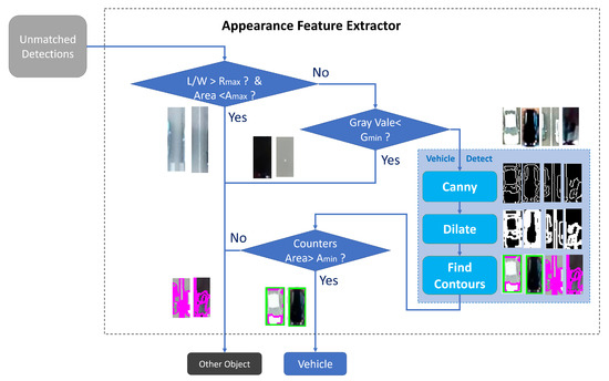 As shown in Figure 7, we first calculate the length–width ratio and area of the detection boxes. We remove the boxes having a length–width ratio larger than the maximum length–width ratio of vehicles and an area smaller than the value of the heavy vehicle , because the detection boxes of vehicles are generally rectangular. Then, we calculate the gray value of the image blocks clipped by the detection boxes and remove the detection boxes with a gray value smaller than the minimum gray value of vehicles . After that, we use the Canny edge detector to find vehicle contours in the image blocks clipped by the detection boxes. The boxes having an area of detected contours that is larger than the minimum contour area of vehicle are true vehicle detection boxes. All of these parameters are set according to the input data and vehicle parameters shown in Table 2.
