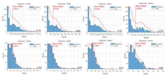 RMSE (first row) and MAPE (second row) histograms of extracted vehicle trajectories under four different weather conditions in the labeled MWUAV dataset.