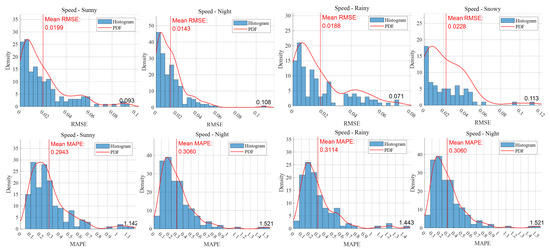RMSE (first row) and MAPE (second row) histograms of extracted vehicle speed under different weather conditions in the labeled MWUAV dataset.