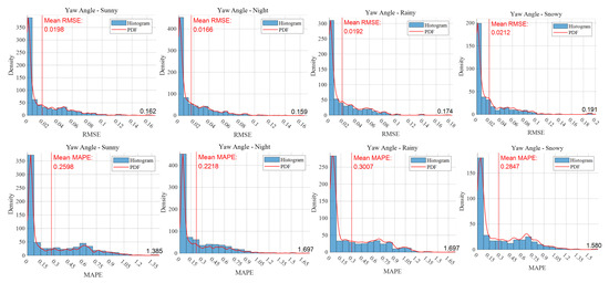 RMSE (first row) and MAPE (second row) histograms of extracted vehicle yaw angle under different weather conditions in the labeled MWUAV dataset.