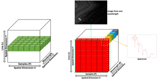 Hyperspectral imaging systems can acquire data using different formats. Our data were acquired resorting to pushbroom hyperspectral cameras, which acquire data simultaneously for each pixel line by line. By combining all the lines, it is possible to obtain a hyperspectral cube represented by a 3D matrix of spectral pixels that can be represented by , where L is the number of lines, P is the number of pixels and W is the number of wavelengths. Each pixel will contain the spectra with the responses in each wavelength, and each pixel will belong to a class assigned by visual inspection. Figure 2 shows a scheme of the data acquired in a single frame using a pushbroom hyperspectral system.