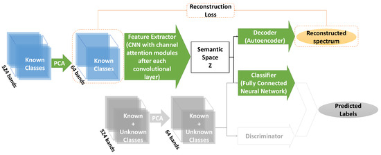 Generalised zero-shot learning (GZSL) solves the problem of classic ZSL approaches, where the prediction step consists of using unknown samples. In this case, our training dataset is composed of multiple spectra, each corresponding to one pixel of the pushbroom hyperspectral data cube, all belonging to known classes. Then, the prediction will also have the unknown classes of which the model has no information and has never seen. Let denote the known classes, while represents the unknown class labels, in which X and Y are the input and the output space, respectively. The input is composed of the , while the output is composed of and . In the GZSL, , with . Given the training data, where belongs to X and the label belongs to , the goal is to extrapolate and recognise the spectra in Y. This algorithm can predict the label from sample , where Y contains both known and unknown classes. The algorithm aims to extract semantic information about X, recognise K, and extrapolate to U, by mapping the training space X into a semantic space Z, and then, this semantic encoding is mapped to a class label.