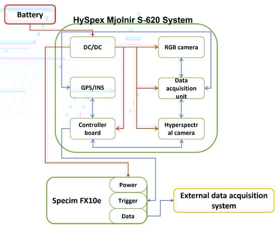 The remote sensing of marine litter with hyperspectral systems from visible to the SWIR range is scarce, a series of issues related to the price of the systems and airborne campaign make it difficult to find available open-source data, and most of the datasets available are from satellite data. Therefore, we resort to a hyperspectral imaging system setup composed of two pushbroom cameras: a Specim FX10e (1024 spatial pixels, spectral range from 400 to 1000 nm) and a HySpex Mjolnir S-620 (620 spatial pixels, spectral range from 970 to 2500 nm). The second camera was inserted into an off-the-shelf system, including a CPU unit, GPS, and an inertial system. Both cameras were synchronised by the HySpex system, controlled by the GPS/INS unit (Applanix APX-15 UAV). Regarding the data acquisition, both cameras acquire data in a raw format that is afterwards calibrated and converted to radiance by the camera manufacturers software, removing the effects of the sensor during the acquisition. The connections between the multiple components of these system are shown in Figure 4, and it is possible to find a detailed description about each module in [5,6].