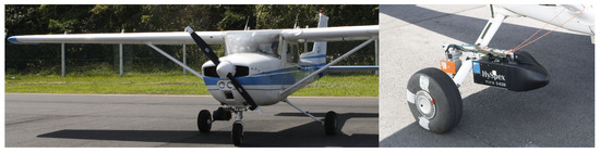 On the left-hand side image, the F-BUMA aircraft, and on the right side of the image, the hyperspectral imaging payload installation on aircraft landing gear.