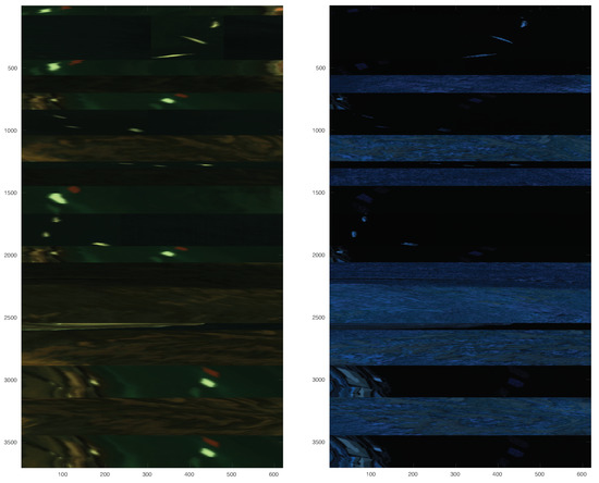 Figure 7 shows the reconstructed image of the dataset for both SPECIM FX10E (400–1000 nm) and HySpex Mjolnir S-620 (970–2500 nm) systems, respectively, where it is possible to observe that there are multiple flybys over all the targets.