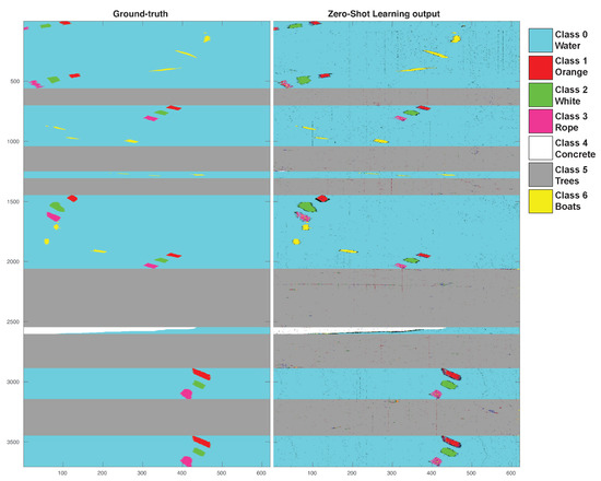 Figure 8 shows the manually annotated ground truth image on the left-hand side, while the right-hand side of the figure contains the ZSL results. Both images follow the same colour scheme to identify the different classes. There are some pixel outliers that represent four more classes, which are represented in orange, light pink, light grey and dark green. The colour scheme for each class is identified in the first column of Table 1. Figure 9 shows a zoom-enhanced version of one of the artificial target detections. It is possible to observe the two unknown classes (class 1—orange target, red colour, and class 3—rope target, pink colour) and some of the outliers around the edges.